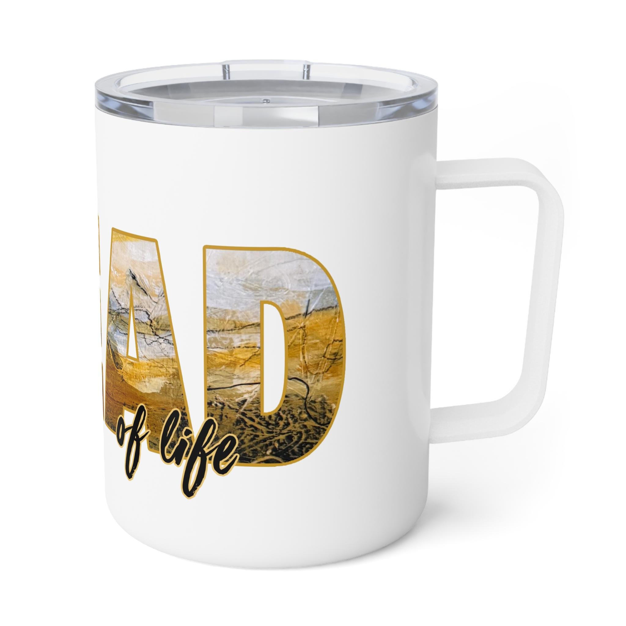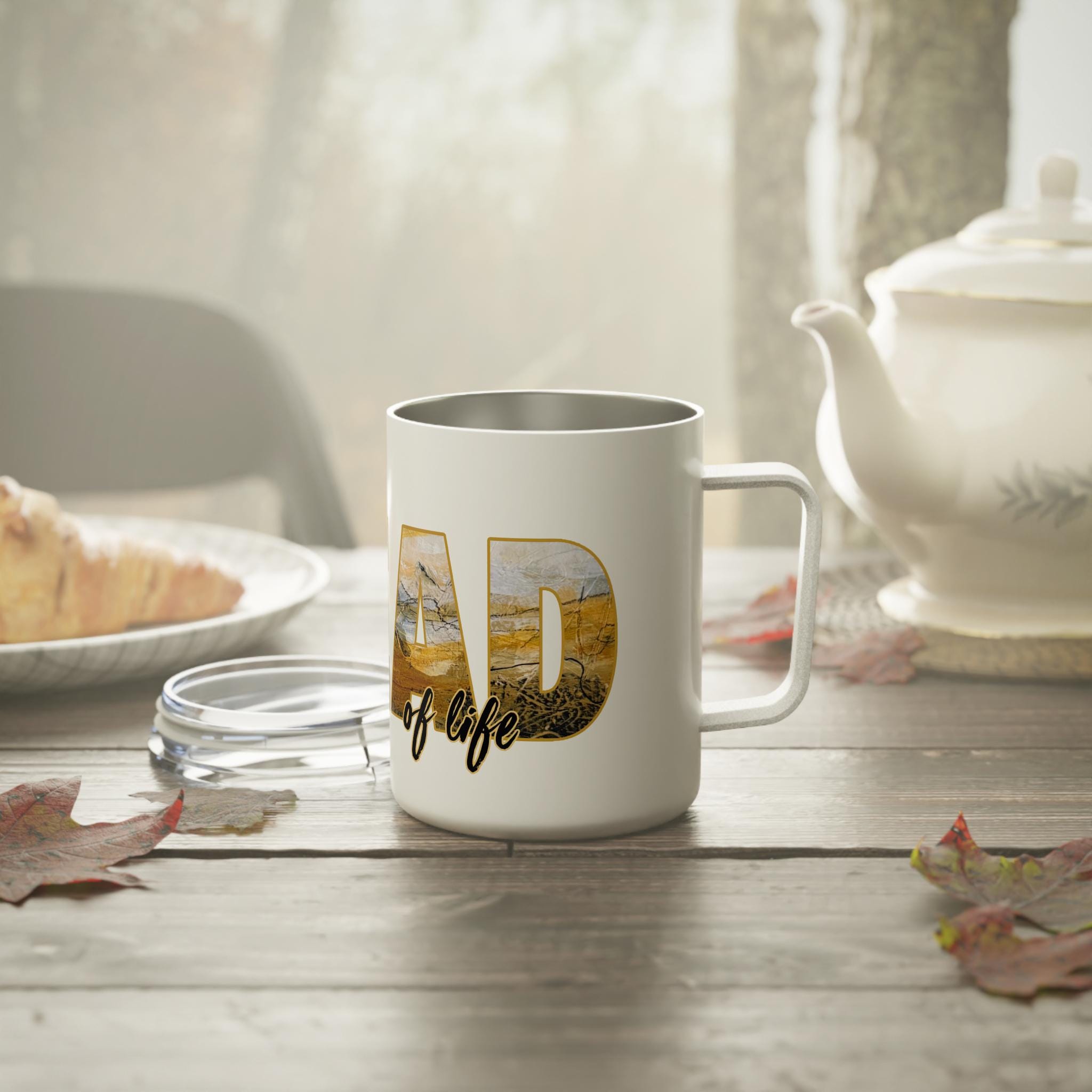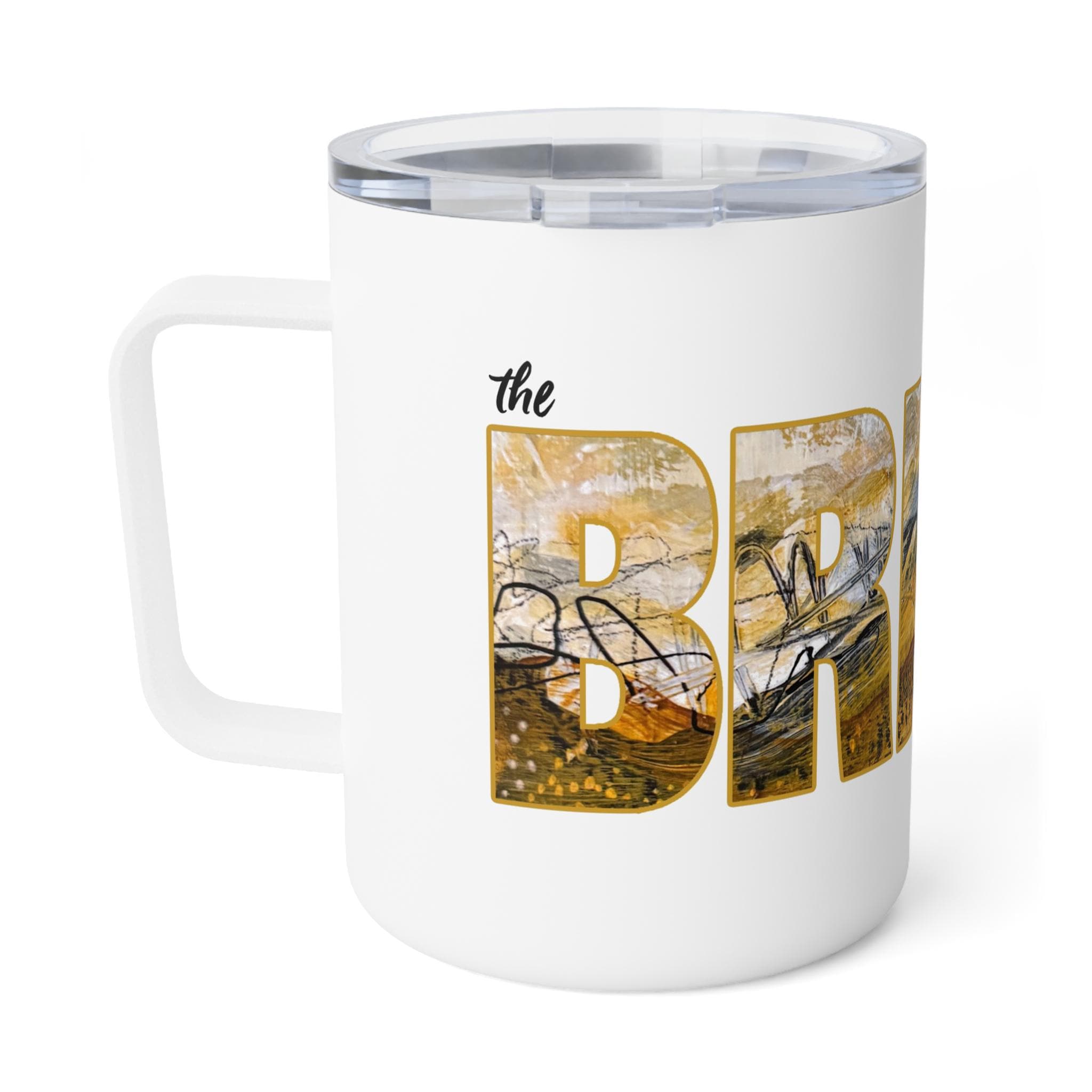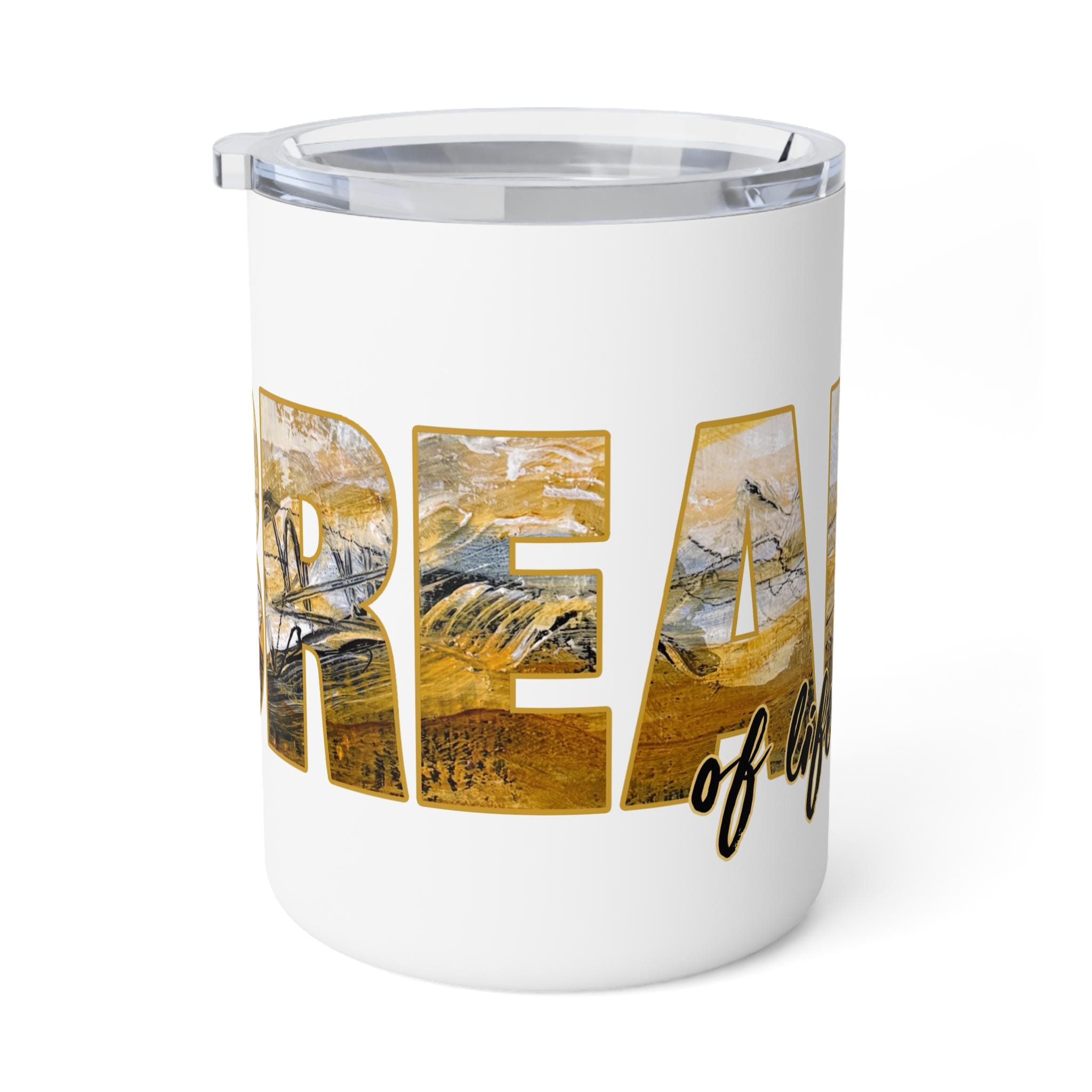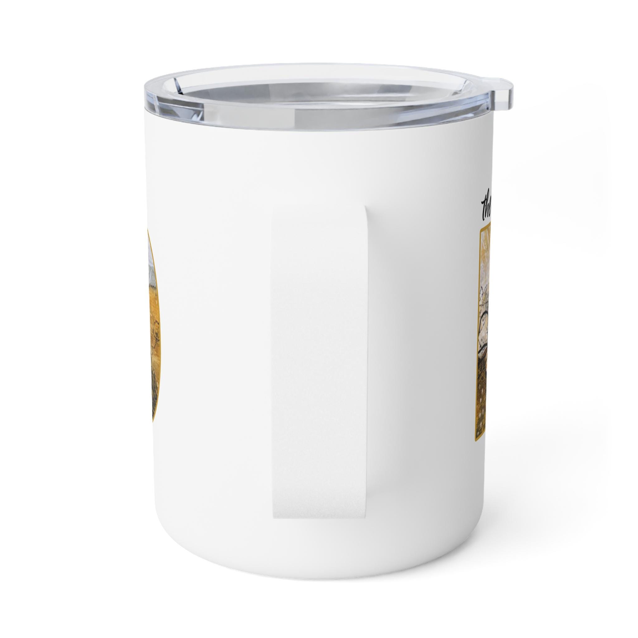 This 10oz insulated coffee mug wraps your morning brew in warmth and quiet charm. Its double-wall stainless steel keeps temperatures steady while the clear push-on acrylic lid lets you sip without losing heat. The glossy, full-color wraparound print features warm, painterly letter art that reads like a small landscape captured inside each letter — a little scene to lift your gaze between sips. Lightweight and durable, it sits comfortably in hand and slips into a bag for commutes, studio mornings, or slow weekends on the porch. Lead- and BPA-free, it’s made to be used every day and to carry moments of calm with your coffee or tea.