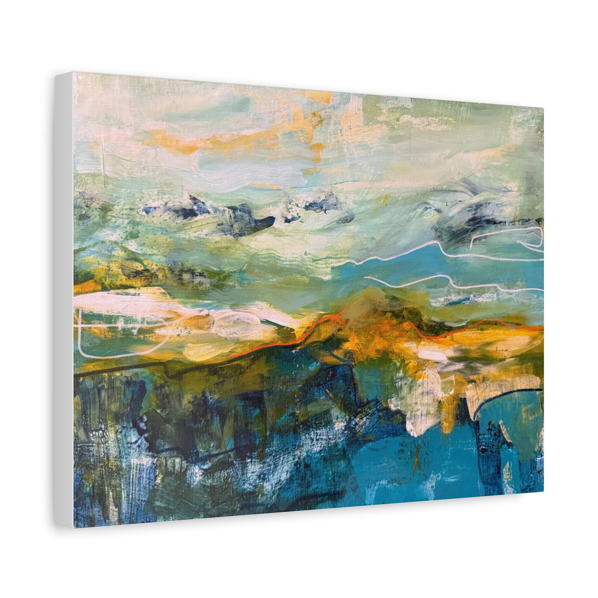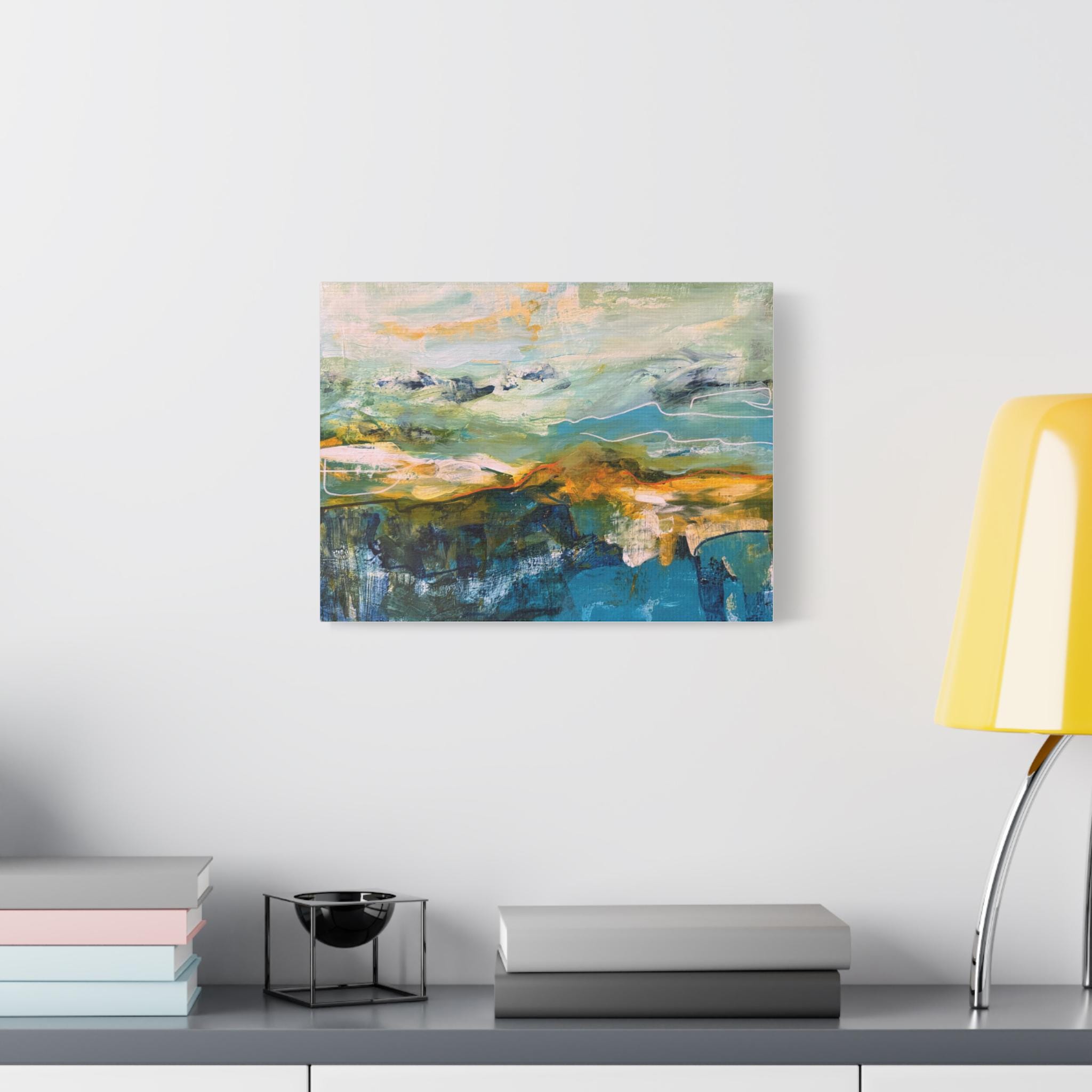 Layers of seafoam greens, deep teal, and sunlit amber come together in this stretched matte canvas to evoke a coastal horizon at the edge of day. The textured brushwork and soft contrasts create a calm, reflective mood—like standing on a cliff and listening to waves push against hidden rocks. Hung above a sofa, entry table, or bedside, this piece brings a gentle, meditative energy to rooms that favor natural color and relaxed, modern styling. The slim 1.25" profile keeps the focus on the art while the subtle matte finish reduces glare and highlights the painterly details.