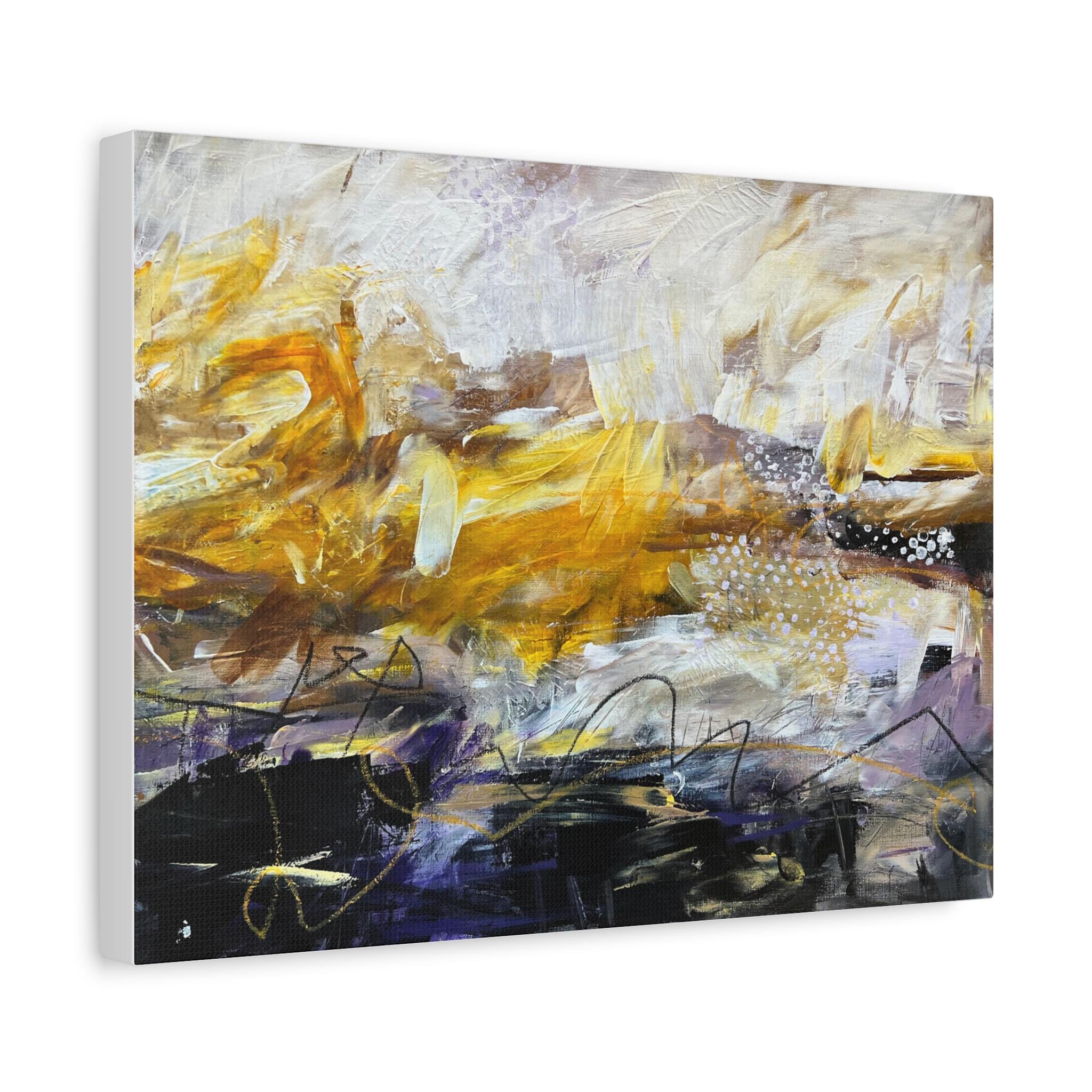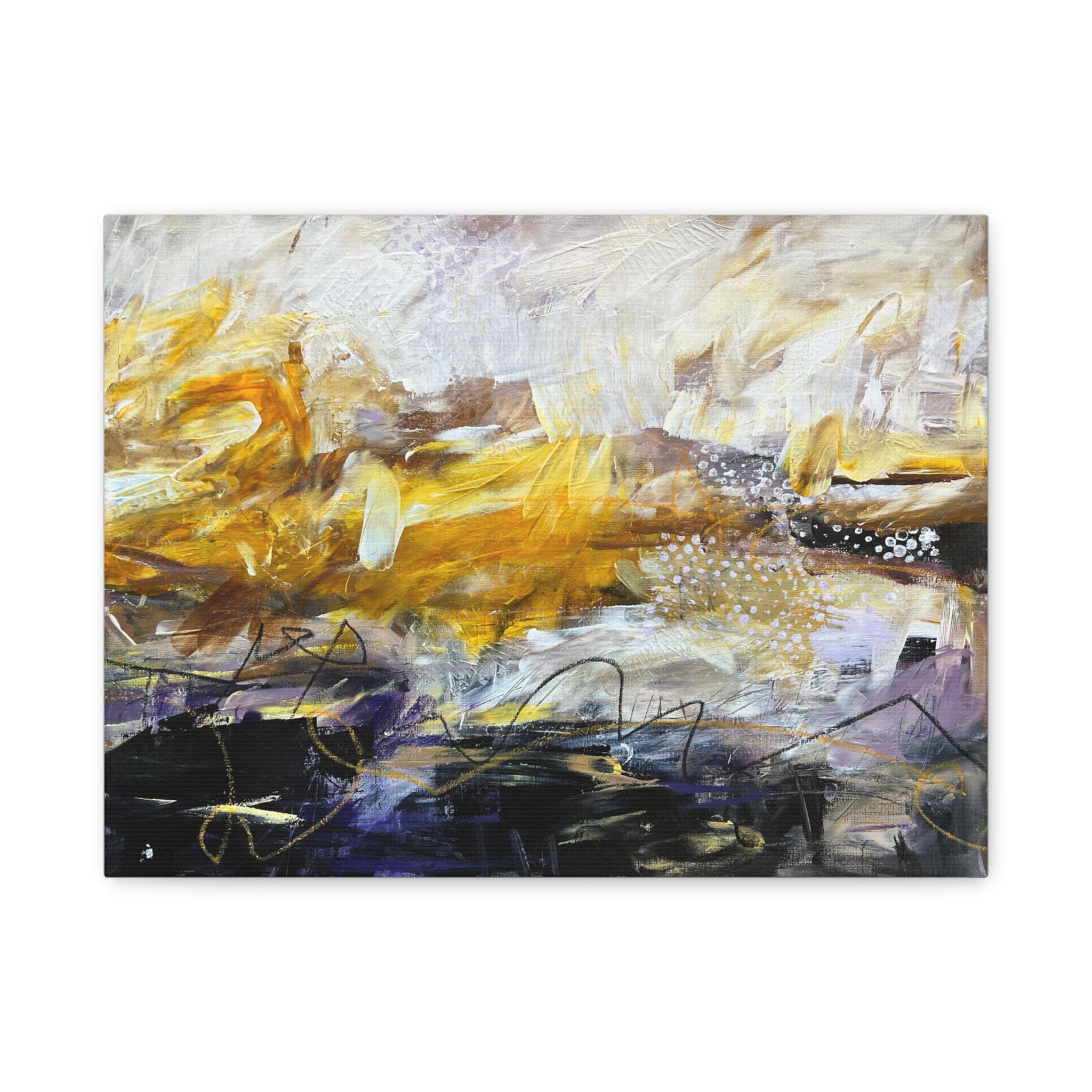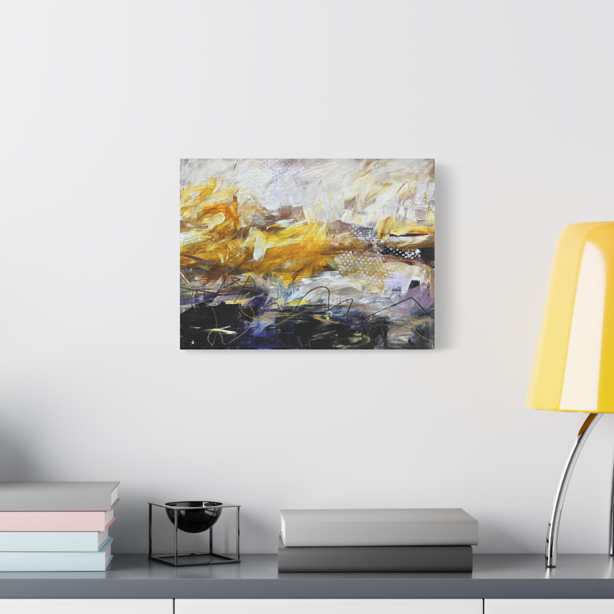This stretched matte canvas brings bold, painterly energy into a room. Layers of warm golds and cool darks collide across textured brushstrokes, creating movement that reads differently from every angle. The 1.25" depth and crisp matte coating keep the colors rich without glare, so the composition feels intimate and layered whether it hangs in a living room, hallway, or creative studio. It’s the kind of piece that starts conversations — quietly expressive, tactile, and warm — and fits naturally into spaces that favor artful, collected interiors and modern bohemian vibes.