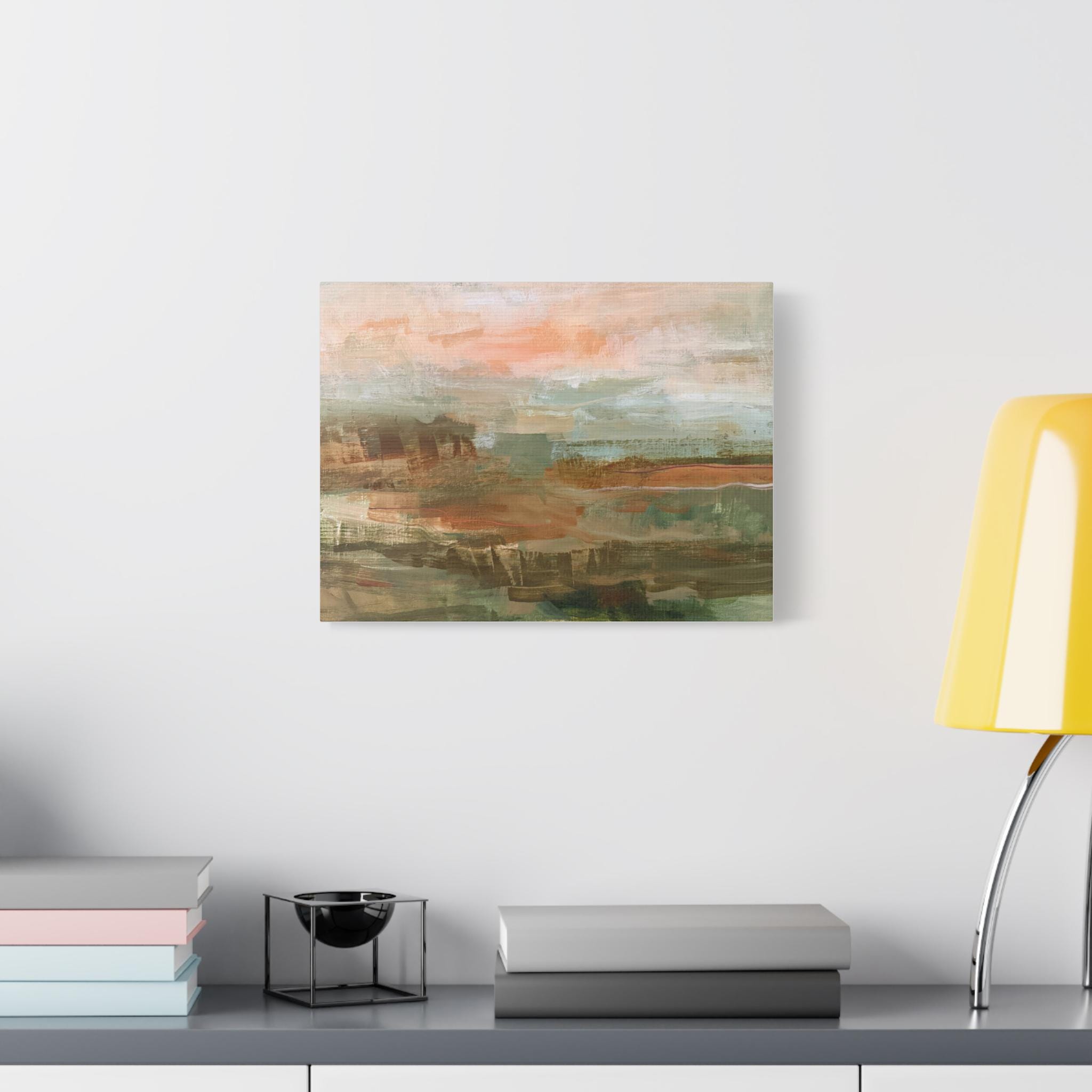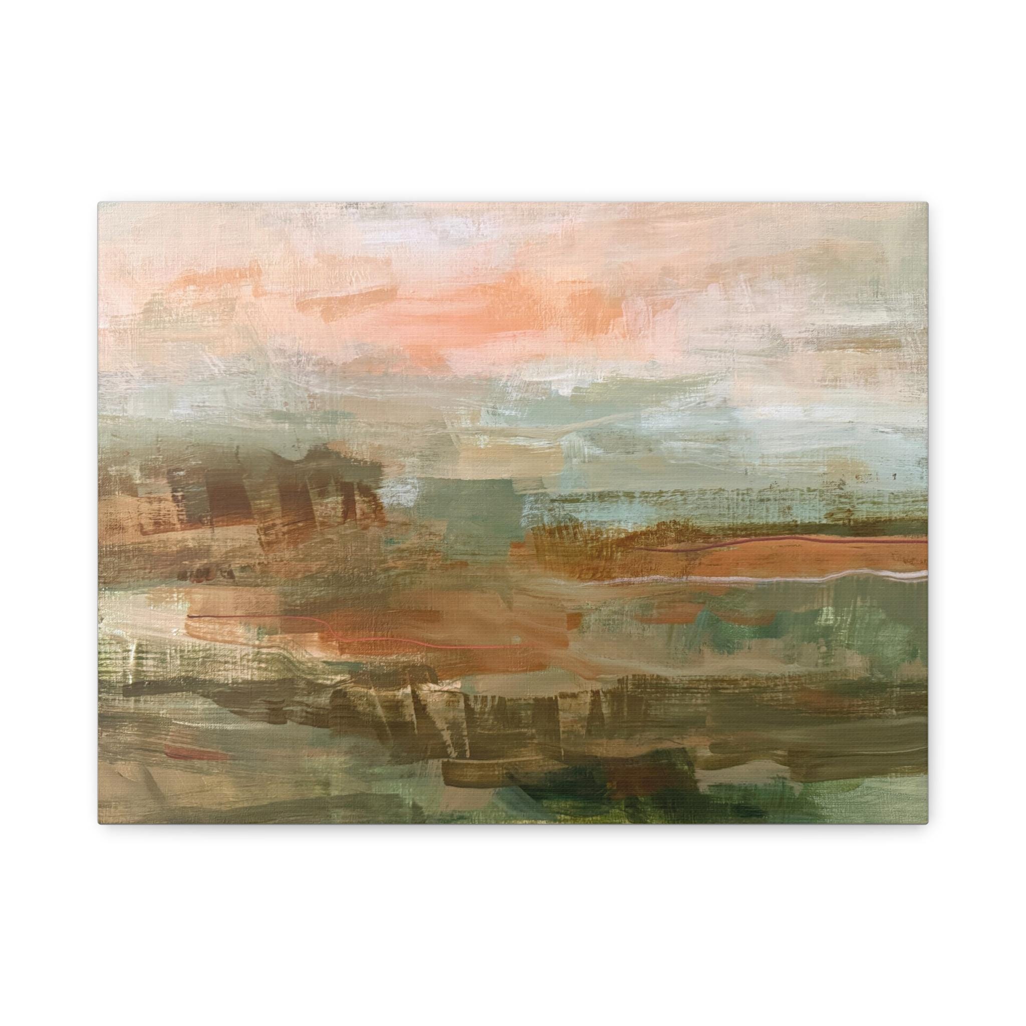 Wide, painterly strokes of warm terracotta, sage green, and soft sand come together here to evoke a quiet, sunlit landscape. This stretched matte canvas brings subtle texture and a calming palette to living rooms, bedrooms, or home offices. Hung above a low dresser or leaned against a mantel, it softens modern lines and adds an easy, organic touch that reads as both contemporary and comfortably lived-in. The muted colors and abstract horizon invite slow looks and make the piece a backdrop for cozy mornings, low-light evenings, and gentle conversations.